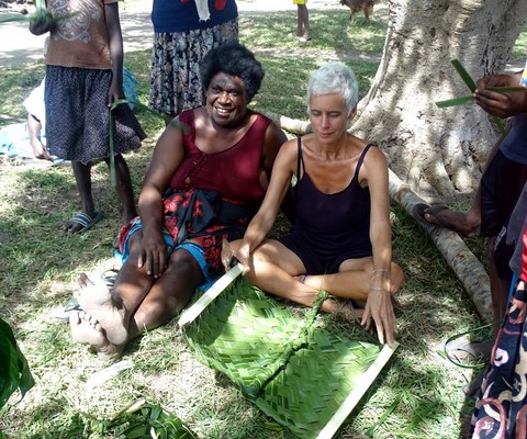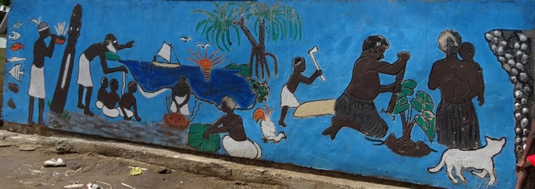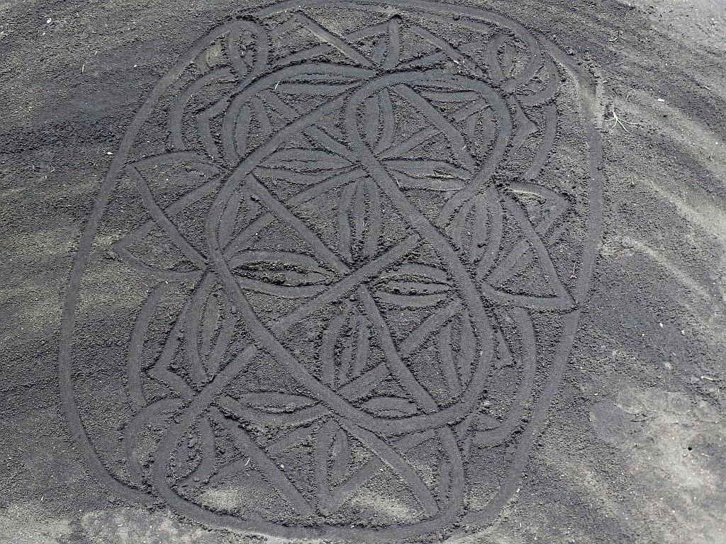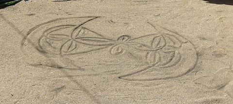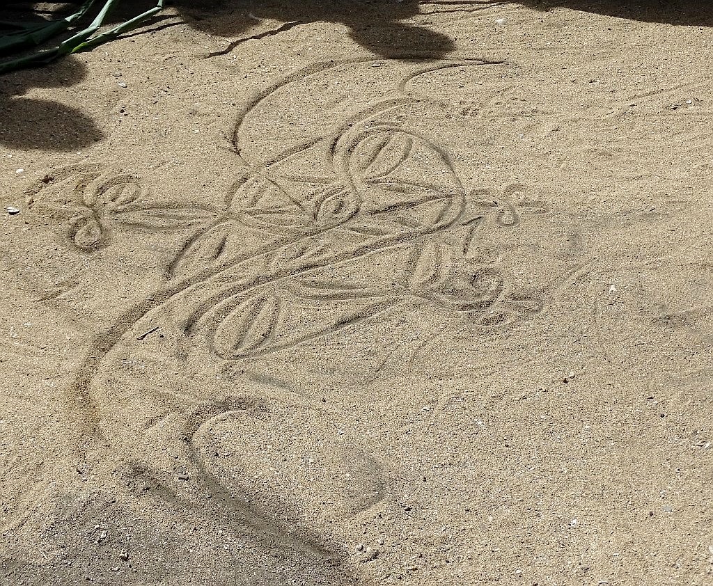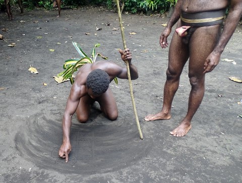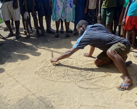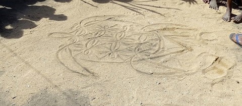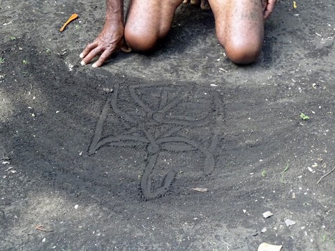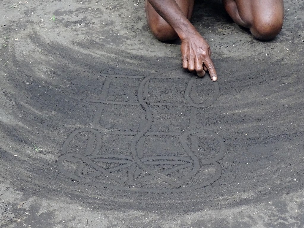 Après le repas d'ignames bien bourratifs , démonstration de dessins sur sable .