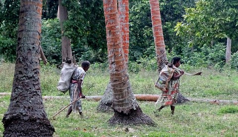 L'ébauche de pirogue est trainée jusqu'à la plage .