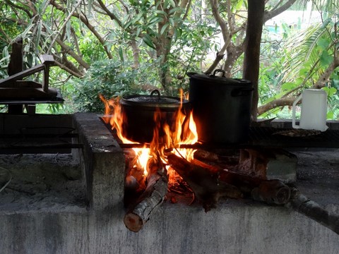 La cuisson est à l'étouffée sur des pierres chauffées au feu de bois .