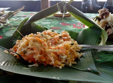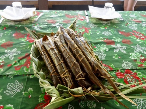 C'est un mélange de manioc et de noix d coco rapés emballé dans de feuille de bananier .