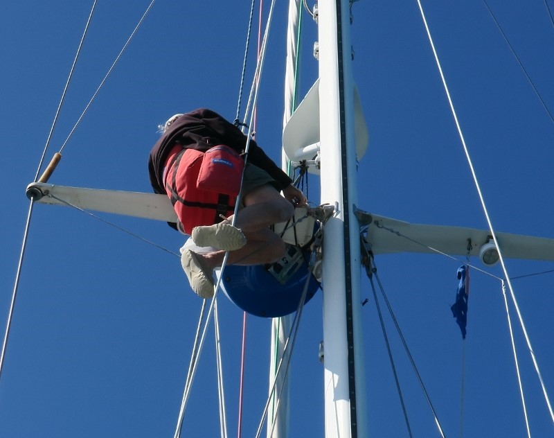Il a sanglé le radar pour que celui-ci , qui ne tenait plus que par son cable , ne s'abime pas en tapant sur le mat et surtout pour qu'il ne s'écrase pas sur le pont .