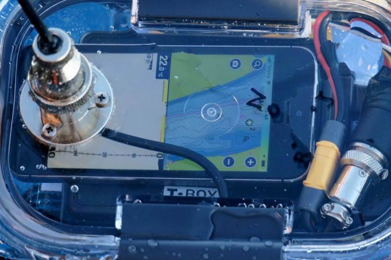 Il va servir à trainer un sondeur qui relèvera les sondes et les reportera directement sur les cartes navionics grâce à un iphone qui sera embarqué dans la boite .