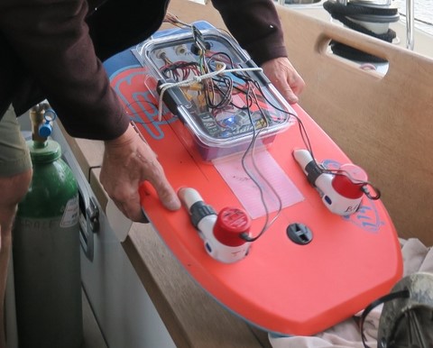 C'est un catamaran radiotélécommandé fait à partir d'une planche de Bodyboard .