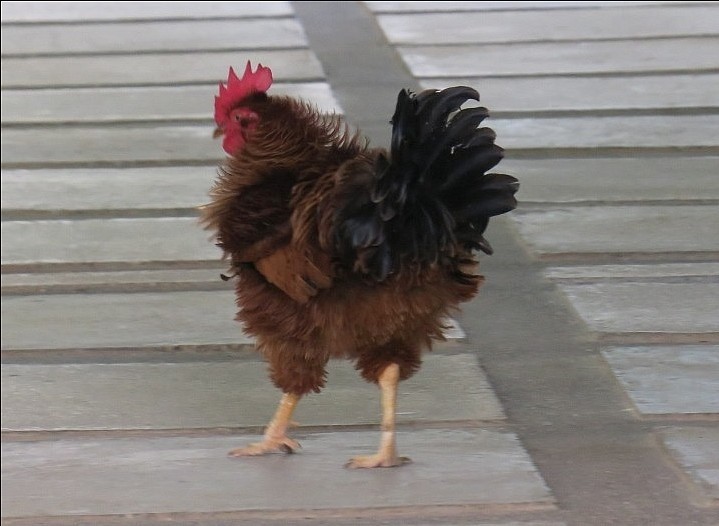 Au bar un coq local dit " coq piquant " Il est tout ébouriffé et très énervé par les poulettes : j'ai du mal à le photographier