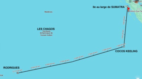 La carte de nos navigations depuis que nous avons quitté l'Indonésie . Les cartes des Cocos Keeling et de Rodrigues ne sont pas dessinées car ils sont si petits ! Ils sont des confettis dans l'océan