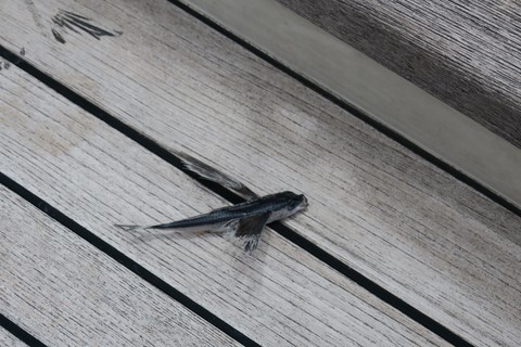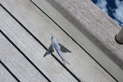 Parfois une trentaine de ces bêbêtes viennent parfumer le pont Il faut savoir qu'un poisson volant sent très mauvais Il faut éviter de marcher dessus , ce qui m'est arrivé une fois Pire je l'ai ramené dans le carré ... Une infection terrible pour mes naseaux sensibles .