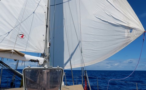 Après une semaine entre 18 et 23 Knots , le vent tombe un peu . Installation des voiles en papillon pour faire une meilleure route