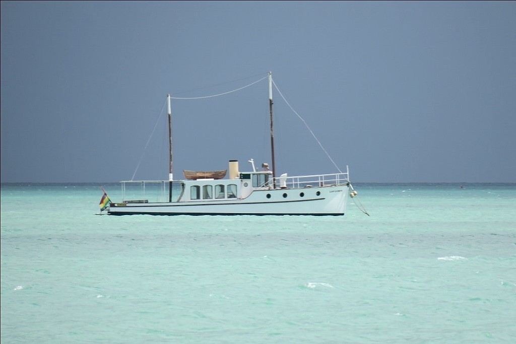 Ce joli bateau est mouillé devant un hôtel à l'entée de la baie