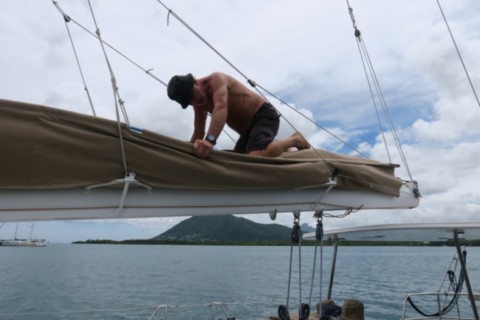 Rangement de la nouvelle grand-voile très raide ( faite en Thaïlande )
