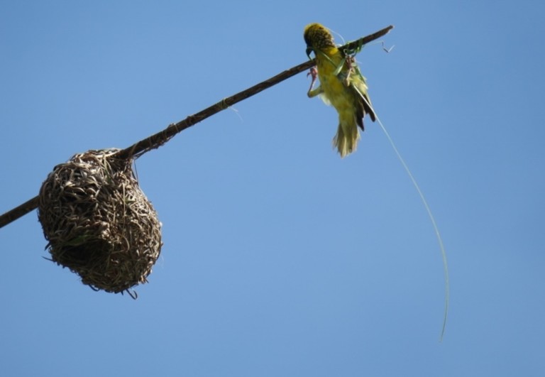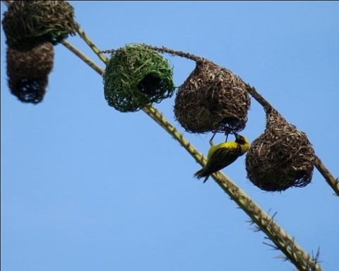 Des oiseaux appelés Tisserin du créole " Ti-serin " ou " serin du Cap "font leur nid
