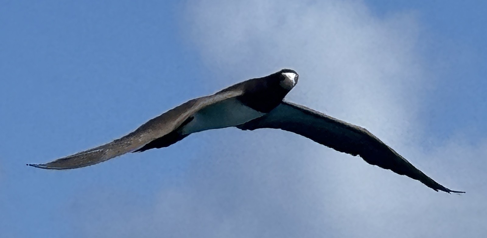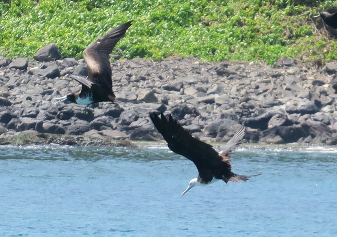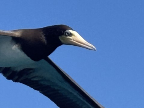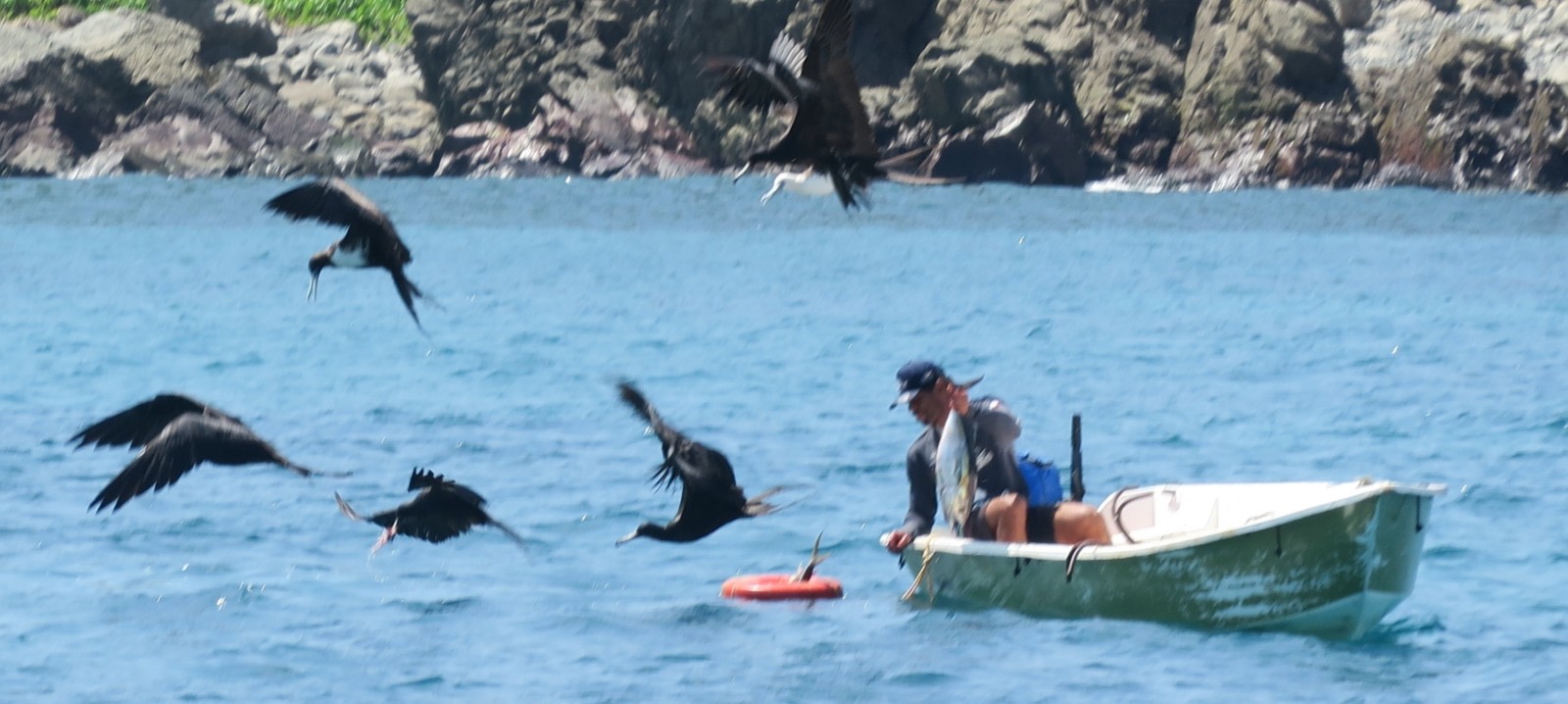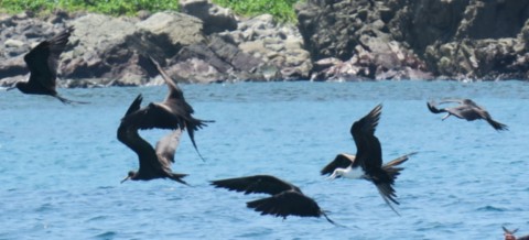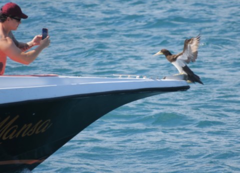 Par contre un fou les survole car quand les dauphins viennent manger