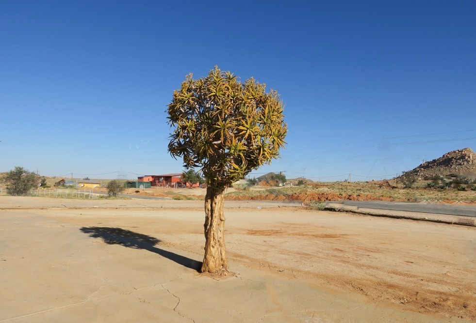 Après avoir parcouru prés de 100 Kms nous arrivons à Aus Ville bizarre ,partagée en 2 , 1 coté des bidonvilles et 1 coté presque résidentiel Nous avons pris le 2° coté bien sur ! Et là au détour d'une route sans aucun intérêt , j'aperçois mon rêve l' arbre à carquois je voulais aller à Keetmanshoop pour voir ces arbres mais pour le doudou c'est NON ! Keetmanshoop est à 500 Kms de Luderitz