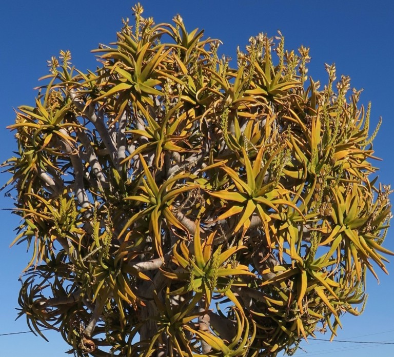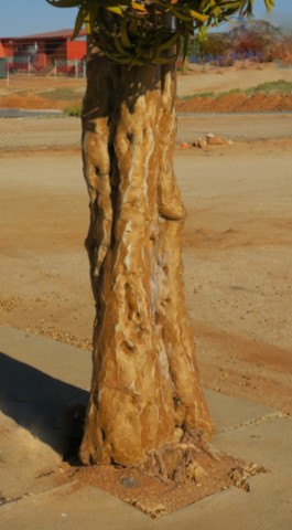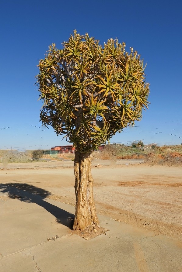 En fait c'est un " aloé dischotoma " ou appelé communément arbre à carquois Les bushmen l'appelent comme cela car ils confectionnent des carquois pour leurs flêches en évidant des branches de cette plante. Son nom spécifique vient du latin dichotomus qui signifie divisé par paires par allusion à sa façon de se développer.