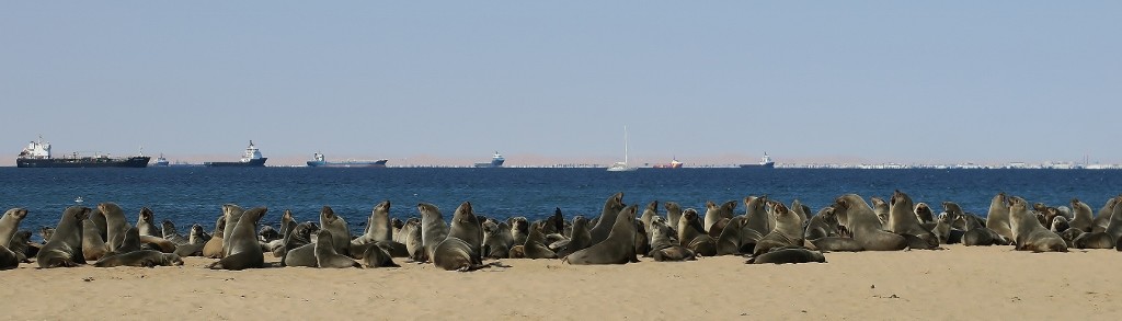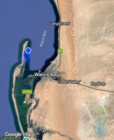 Nous quittons Luderitz et allons à Walvis Bay plus au nord Et nous mouillons à l'entrée de la baie car encore une fois nous sommes arrivés tard A la nuit tombante