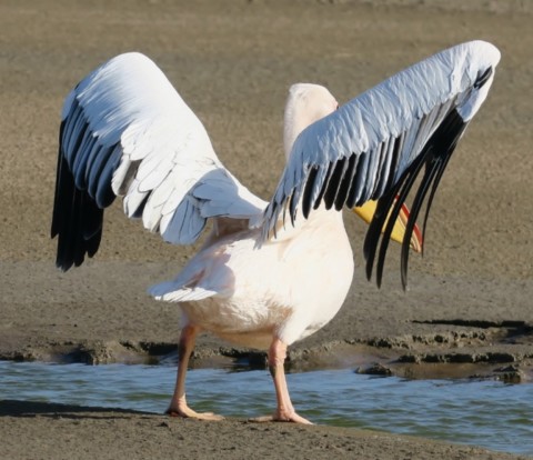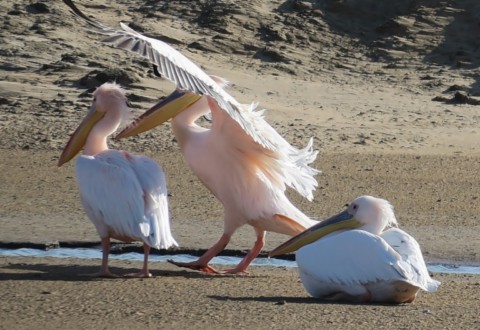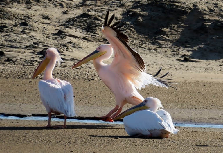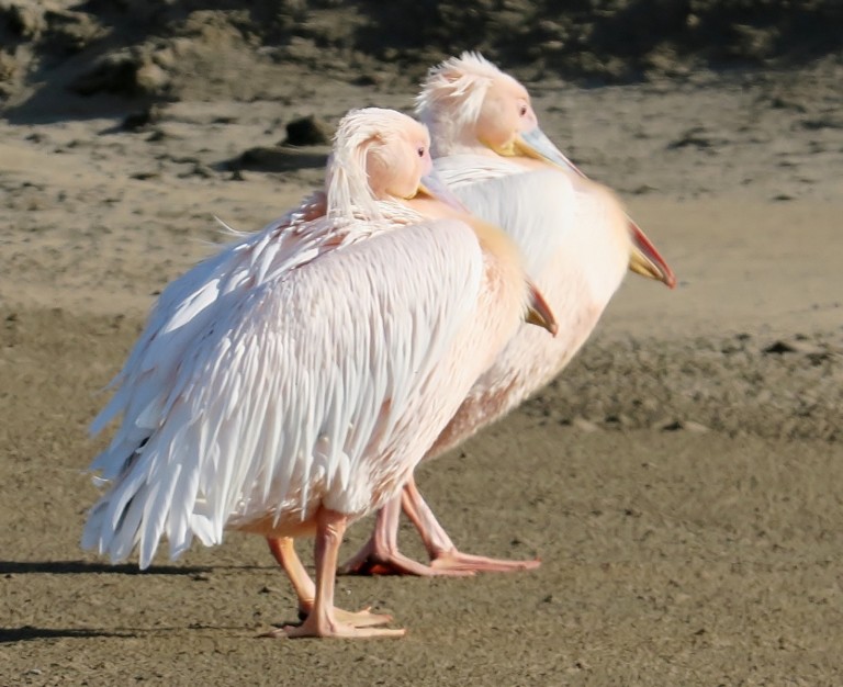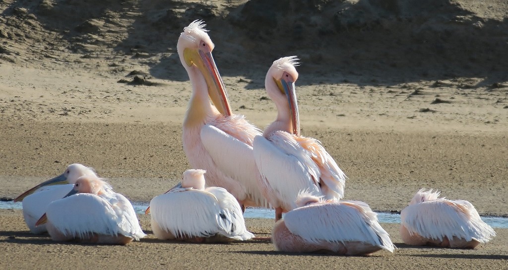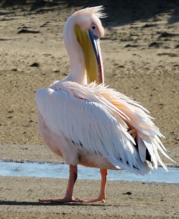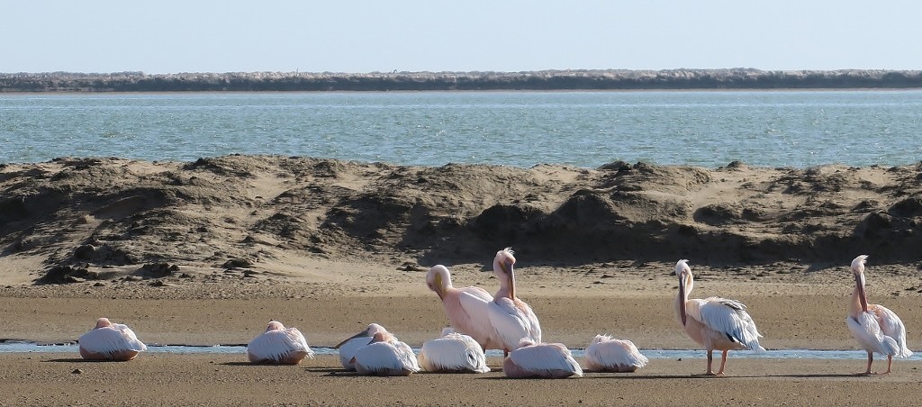 Aujourd'hui le brouillard laisse la place à un super ciel bleu Nous retournons sur la péninsule et nous voyons un groupe de pélicans roses Leur corps est rose mais les ailes restent blanches Ce sont les pélicans Rufucens . Nous avons eu de la chance car ils sont rares