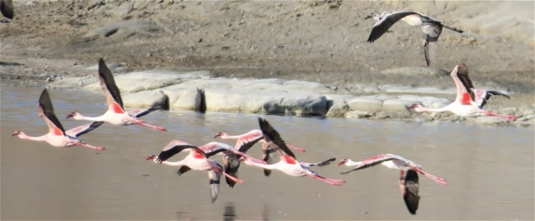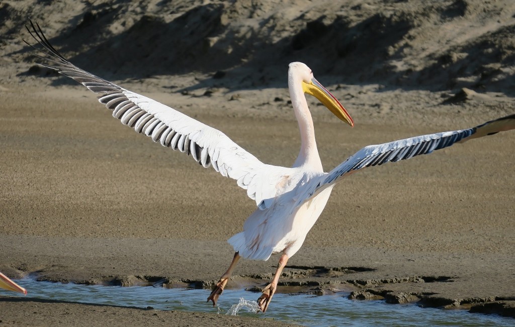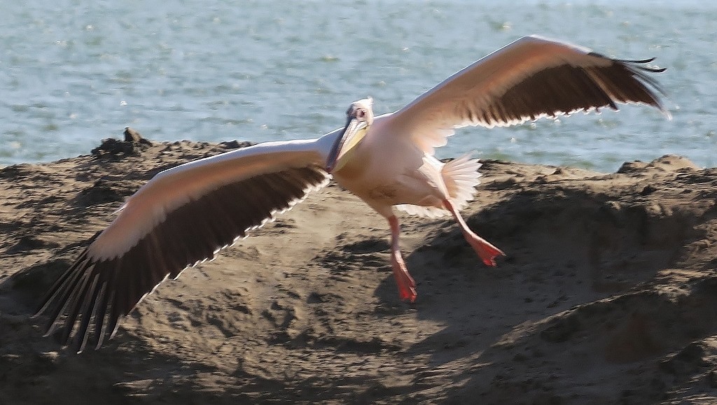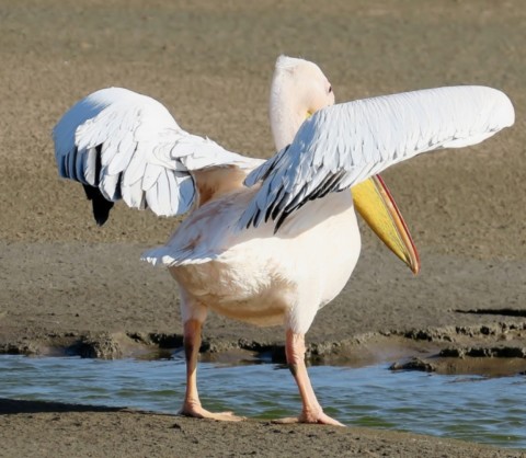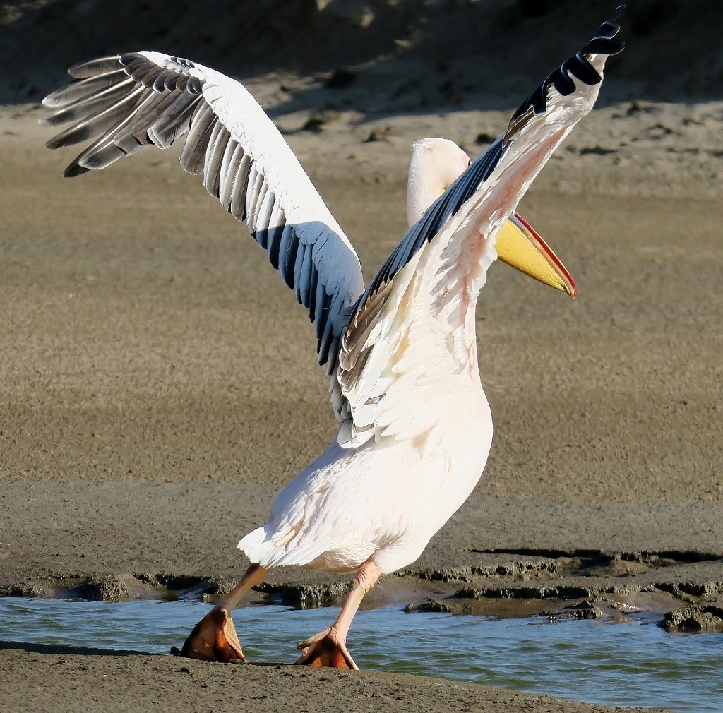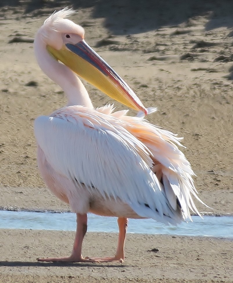 Aujourd'hui le brouillard laisse la place à un super ciel bleu Nous retournons sur la péninsule et nous voyons un groupe de pélicans roses Leur corps est rose mais les ailes restent blanches Ce sont les pélicans Rufucens . Nous avons eu de la chance car ils sont rares
