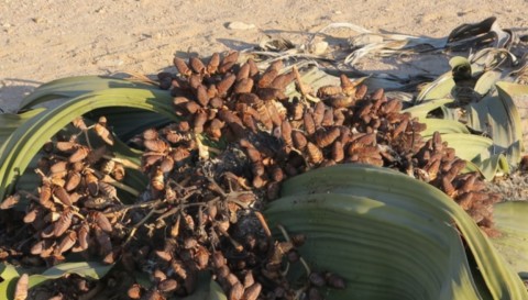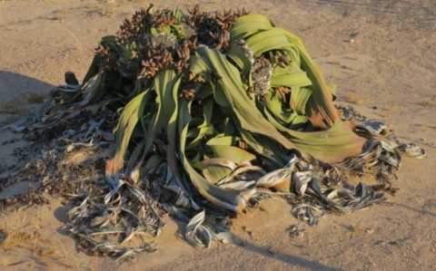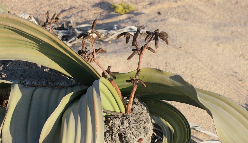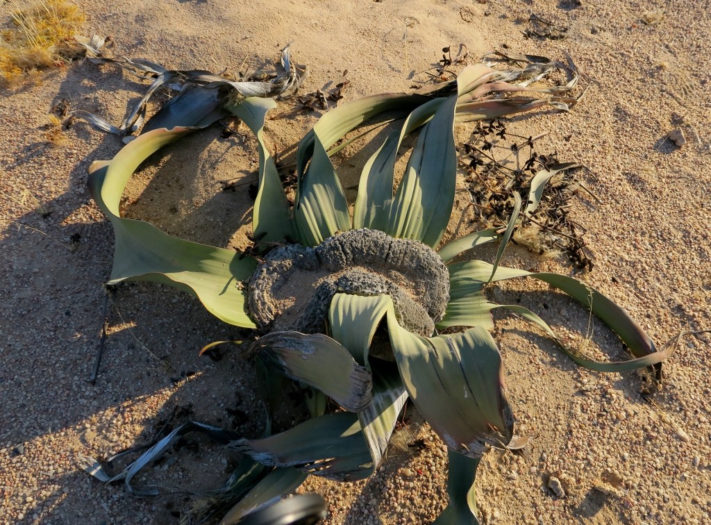 Dans ce paysage quelque peu désertique poussent des plantes " moches " C'est le doudou qui les a baptisé ainsi ! Les Welwitschia Mirabilis Il est vrai que cette plante n'est pas très belle mais elle est exceptionnelle Elle pousse exclusivement dans le désert côtier de Namibie et en Angola