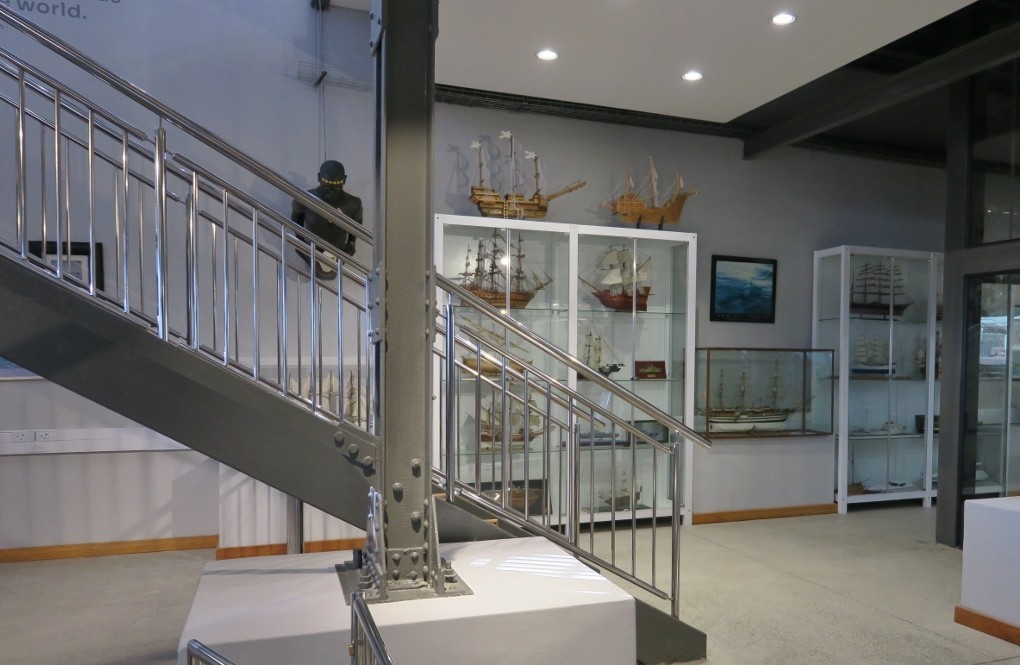Puis , un homme devant un grand bâtiment , nous dit qu'il y a un musée maritime , ainsi qu'1 restaurant , 1 salle de fitness , et un hôtel ! il a su titiller notre curiosité Et il a eu bien raison Luderitz , ville de 12 000 Habitants , a un musée maritime magnifique Nous y avons passé 3 h sans voir passer le temps 4 étages magnifiquement aménagés dans les locaux de la centrale électrique . Cette dernière ayant brûlé C'est le gouvernement et la société minière des diamants ( La Named ) qui ont contribué à son financement . C'est un squelette de baleine .