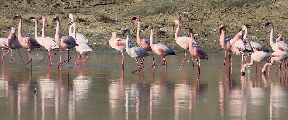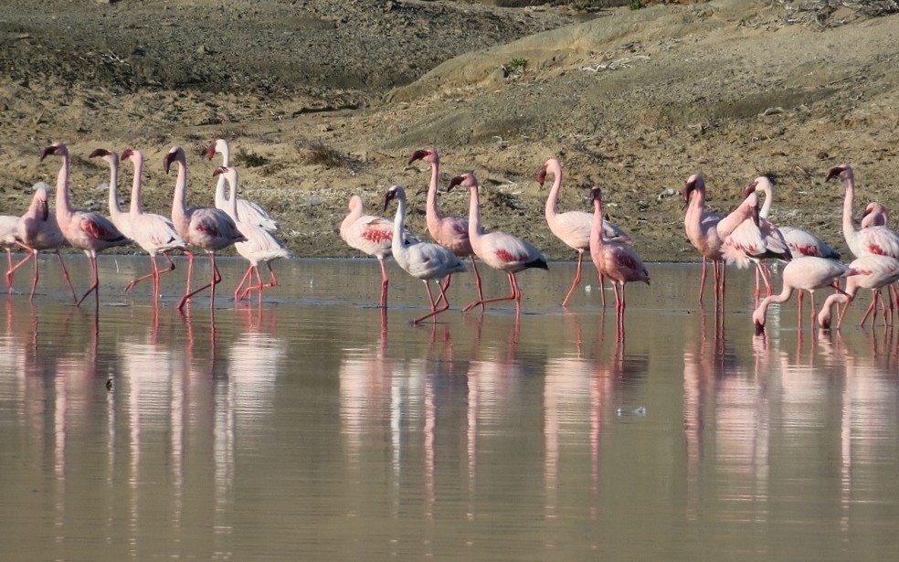 il y a des lacs roses ou prolifèrent des algues caroténoïdes qui colorent l'eau et les flamants roses également .