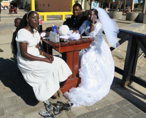 Des jeunes mariés nous proposent de prendre des photos d'eux ... Incroyable ! La mariée au téléphone et pied nus avec une robe magnifique .
