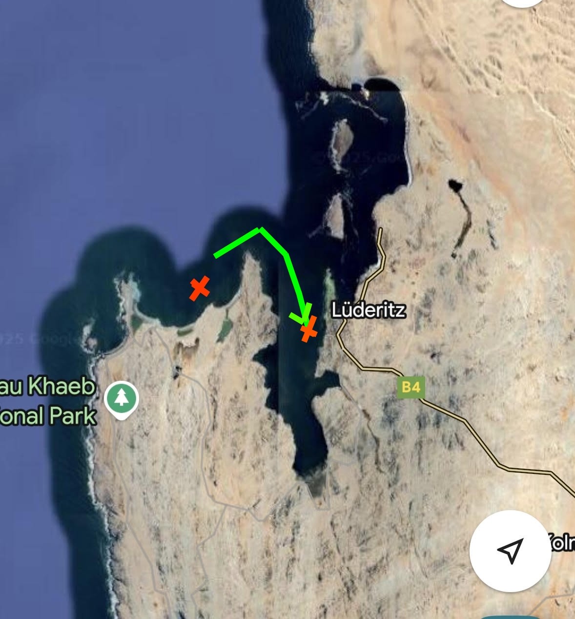 Nous sommes arrivés vers minuit à Luderitz , premier arrêt possible en Namibie Et heureusement il y a un baie juste avant le mouillage officiel Une baie presque vide d'obstacle sauf 2 balises bien éclairées un vrai bonheur !