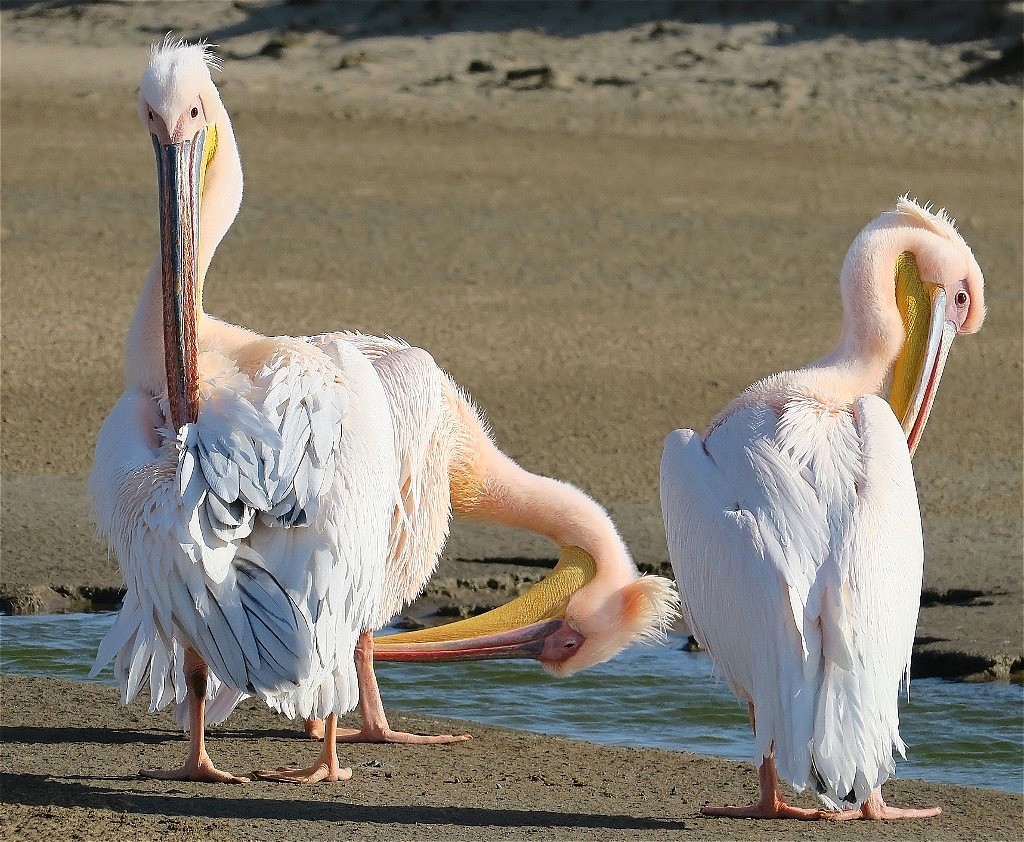 Aujourd'hui le brouillard laisse la place à un super ciel bleu Nous retournons sur la péninsule et nous voyons un groupe de pélicans roses Leur corps est rose mais les ailes restent blanches Ce sont les pélicans Rufucens . Nous avons eu de la chance car ils sont rares